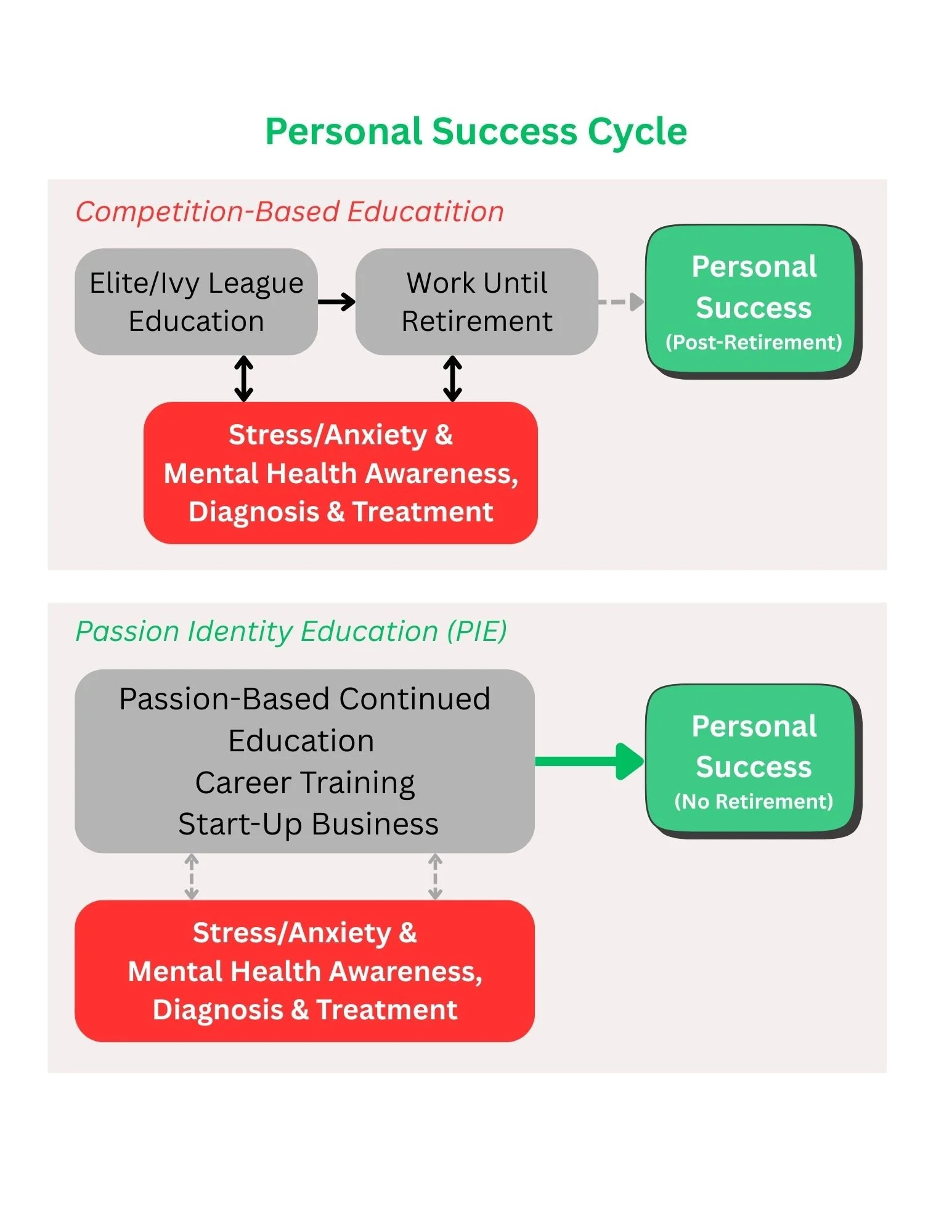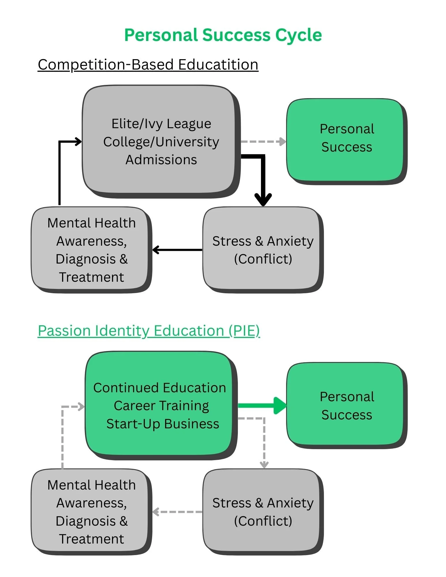 Our youth education system has evolved into a competition-based, cycle of stress. Society strongly encourages the pursuit of admission to elite/ivy league schools upon high school graduation as the path to personal success. With many institutions reporting a change of major during the 4 year period for as many as 75% of its students, despite many having already indicated stress and negative feelings and toward high school. Youth enter college without knowing what they want to study while attempting to recover from the stress they experienced in high school is a formula for continued stress, not personal success. The effort to address the resulting youth mental health pandemic with a heavy societal investment in awareness, diagnosis, and treatment is helpful, but has not resulted in a mental health illness trend reversal.