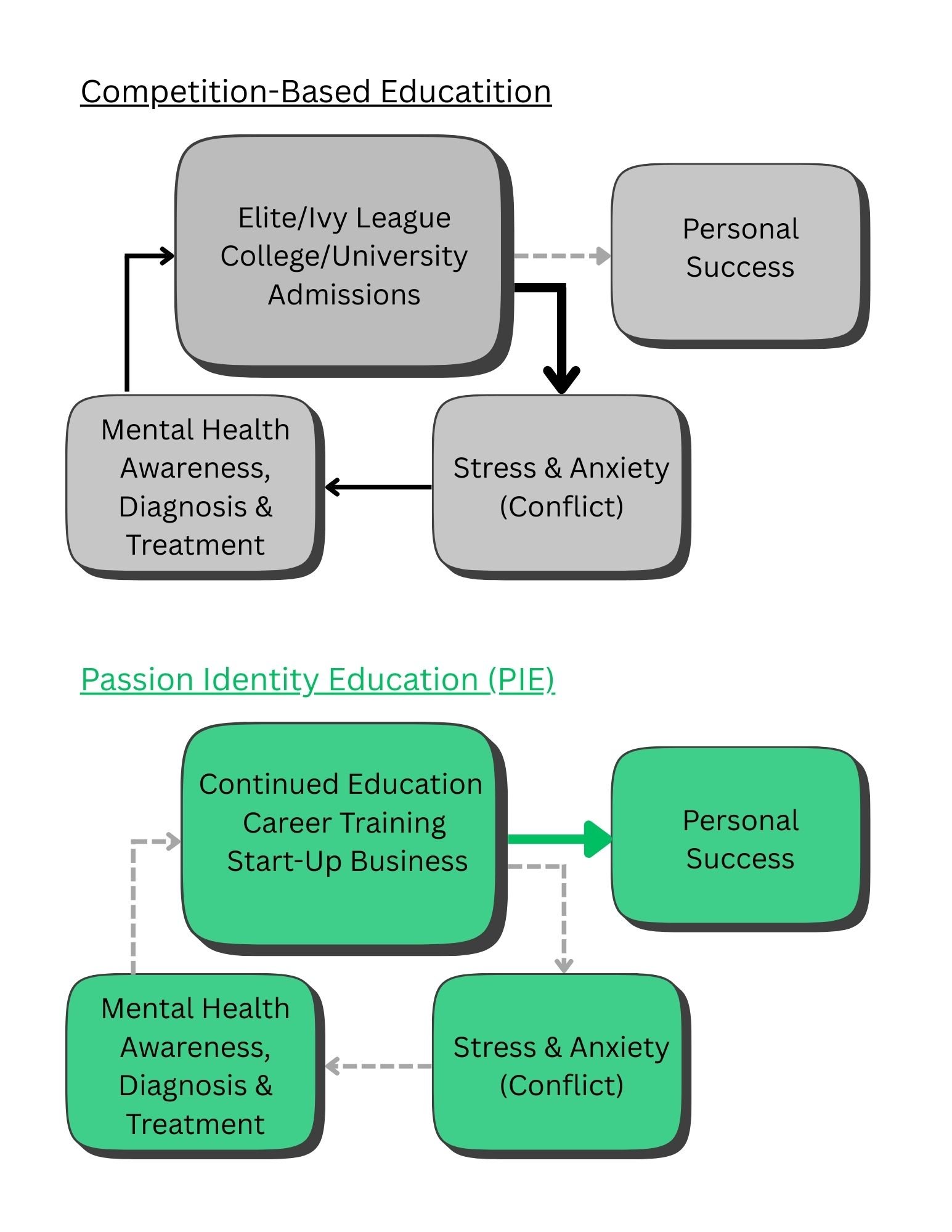 The new paradigm shows that this ancient model is broken and explains why it drives the high level of disdain towards high school, which has led to our current youth mental health pandemic. Today’s youth are no longer sold on the idea of waiting until retirement to experience the joy, happiness, and passion that life has to offer. They want to experience it now. Many fear that the jobs they are preparing to fill will be replaced by AI or other societal landscape shifts. Even if they still exist, the idea of working at a job they don’t like until they eligible for retirement, as their parents did, is unappealing. They’ve watched their parents waste their lives working jobs they hate, then retiring with little vitality, joy, passion, or money to show for their efforts. Today’s youth want joy today and a system that deprives them of this joy is dictating the inner conflict that reveals itself as mental illness. Without rocking the establishment, PIE offers hope!